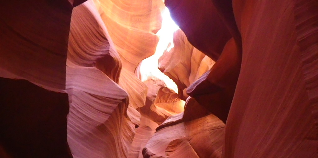 Page, deuxième jour : nous suivons un guide Navajo dans les entrailles de la terre... On se glisse entre deux parois par des échelles pour atteindre un labyrinthe minéral à moins 50 mètres. Effets d'ombres et de lumières, nuances délicates de marron, jaune, rouge, orange ou rose... on a eu beaucoup de... Lire plus